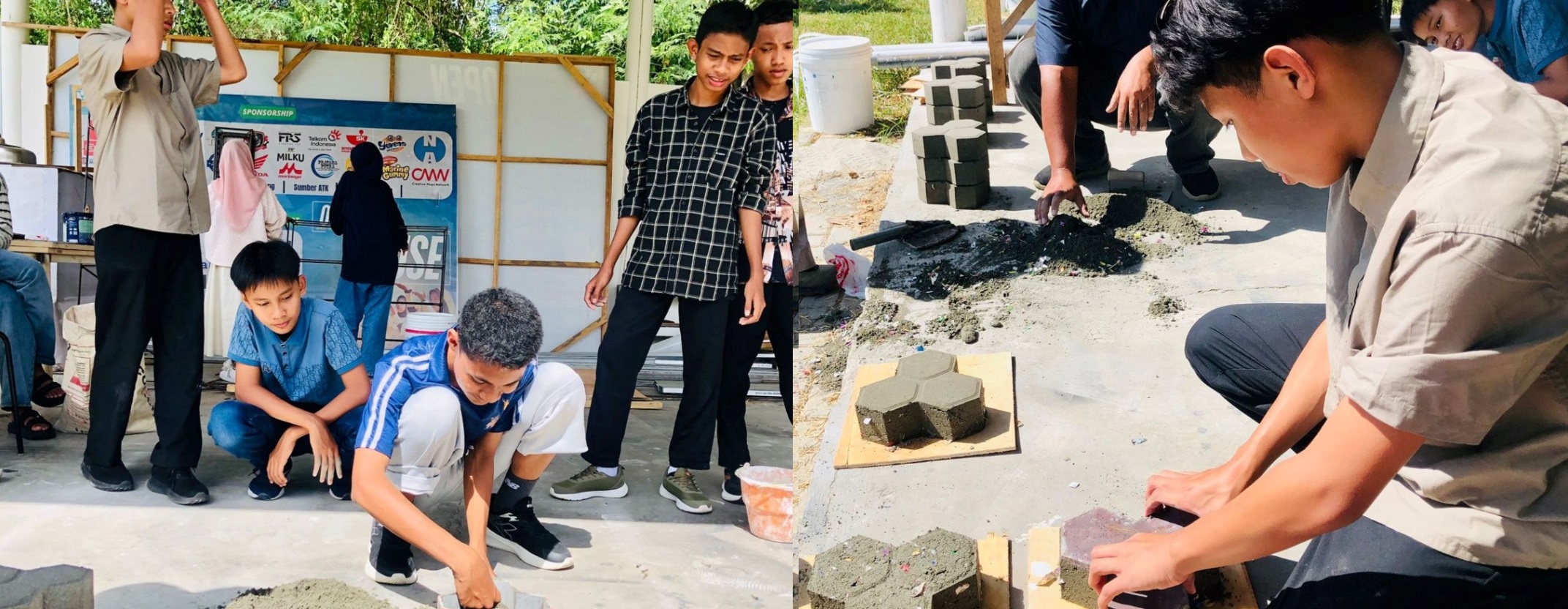 Dipandu oleh Pak Bayu, Site Manager Yayasan Sukma, proses dimulai dengan mencacah manual sampah plastik yang telah dikumpulkan—sebuah langkah yang justru sarat nilai edukasi. Dengan peralatan yang terbatas, seperti hanya satu unit mesin cetak, siswa secara bergiliran terlibat langsung dalam setiap tahapan: mencampur biji plastik, semen, pasir, dan air, lalu melakukan pencetakan.
